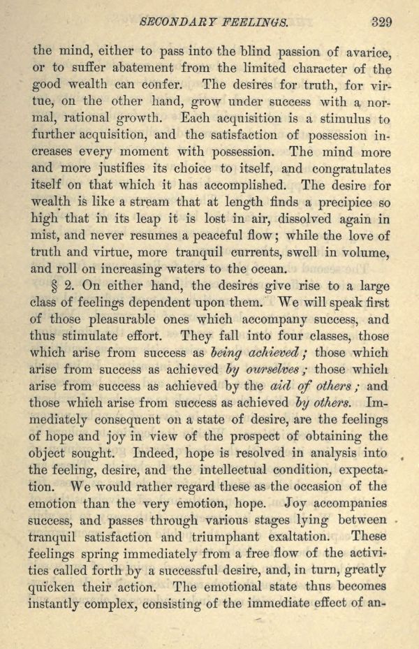 2. On either hand, the desires give rise to a large class of feelings dependent upon them. We will speak first of those pleasurable ones which accompany success, and thus stimulate effort. They fall into four classes, those which arise from success as being achieved; those which arise from success as achieved by ourselves; those which arise from success as achieved by the aid of others; and those which arise from success as achieved by others. Immediately consequent on a state of desire, are the feelings of hope and joy in view of the prospect of obtaining the object sought. Indeed, hope is resolved in analysis into the feeling, desire, and the intellectual condition, expectation. We would rather regard these as the occasion of the emotion than the very emotion, hope. Joy accompanies success, and passes through various stages lying between tranquil satisfaction and triumphant exaltation. These feelings spring immediately from a free flow of the activities called forth by a successful desire, and, in turn, greatly quicken their action. The emotional state thus becomes instantly complex, consisting of the immediate effect of anticipated