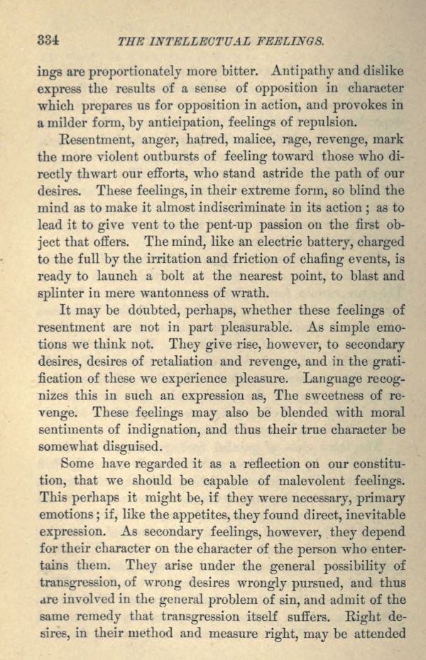 It may be doubted, perhaps, whether these feelings of resentment are not in part pleasurable. As simple emotions we think not. They give rise, however, to secondary desires, desires of retaliation and revenge, and in the gratification of these we experience pleasure. Language recognizes this in such an expression as, The sweetness of revenge. These feelings may also be blended with moral sentiments of indignation, and thus their true character be somewhat disguised.