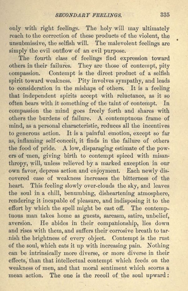 The fourth class of feelings find expression toward others in their failures. They are those of contempt, pity compassion. Contempt is the direct product of a selfish spirit toward weakness. Pity involves sympathy, and leads to consideration in the mishaps of others. It is a feeling that independent spirits accept with reluctance, as it so often bears with it something of the taint of contempt. In compassion the mind goes freely forth and shares with others the burdens of failure. A contemptuous frame of mind, as a personal characteristic, reduces all the incentives to generous action. It is a painful emotion, except so far as, inflaming self-conceit, it finds in the failure of others the food of pride. A low, disparaging estimate of the powers of 'men, giving birth to contempt spiced with misanthropy, will, unless relieved by a marked exception in our own favor, depress action and enjoyment. Each newly discovered case of weakness increases the bitterness of the heart. This feeling slowly over-clouds the sky, and leaves the soul in a chill, benumbing, disheartening atmosphere, rendering it incapable of pleasure, and indisposing it to the effort by which the spell might be cast off. The contemptuous man takes home as guests, sarcasm, satire, unbelief, aversion. He abides in their companionship, lies down and rises with them, and suffers their corrosive breath to tarnish the brightness of every object. Contempt is the rust of the soul, which eats it up with increasing pain. Nothing can be intrinsically more diverse, or more diverse in their effects, than that intellectual contempt which feeds on the weakness of men, and that moral sentiment which scorns a mean action. The one is the recoil of the soul upward: