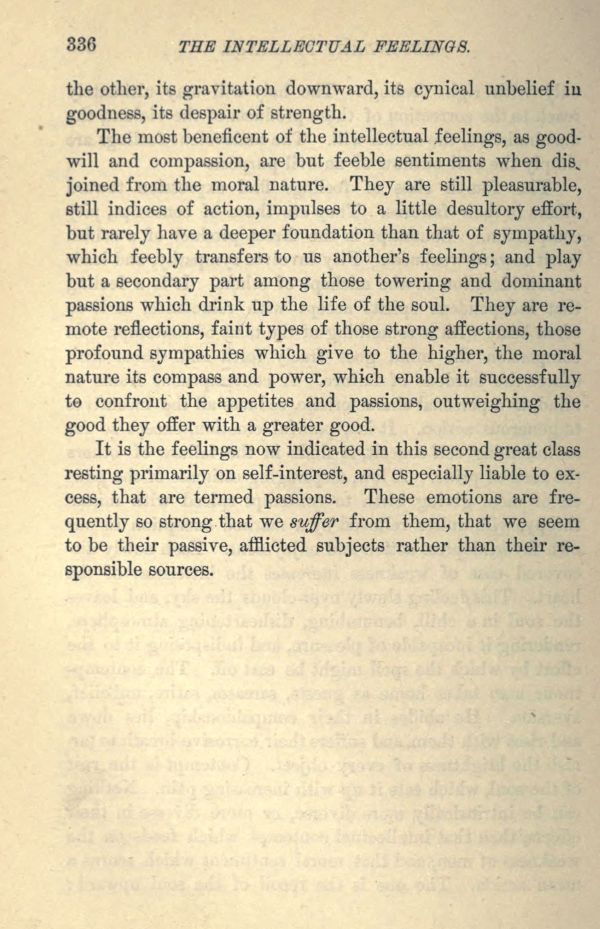 The most beneficent of the intellectual feelings, as goodwill and compassion, are but feeble sentiments when disjoined from the moral nature. They are still pleasurable, still indices of action, impulses to a little desultory effort, but rarely have a deeper foundation than that of sympathy, which feebly transfers to us another's feelings; and play but a secondary part among those towering and dominant passions which drink up the life of the soul. They are remote reflections, faint types of those strong affections, those profound sympathies which give to the higher, the moral nature its compass and power, which enable it successfully to confront the appetites and passions, outweighing the good they offer with a greater good.