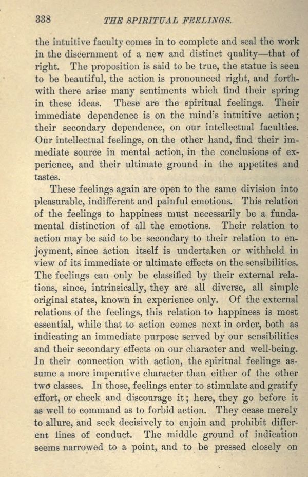 the intuitive faculty comes in to complete and seal the work in the discernment of a new and distinct quality that of right. The proposition is said to be true, the statue is seen to be beautiful, the action is pronounced right, and forthwith there arise many sentiments which find their spring in these ideas. These are the spiritual feelings. Their immediate dependence is on the mind's intuitive action; their secondary dependence, on our intellectual faculties. Our intellectual feelings, on the other hand, find their immediate source in mental action, in the conclusions of experience, and their ultimate ground in the appetites and tastes.