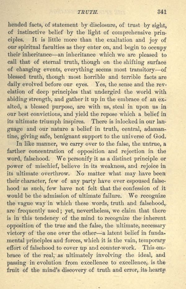 facts, of statement by disclosure, of trust by sight, of instinctive belief by the light of comprehensive principles. It is little more than the exaltation and joy of our spiritual faculties as they enter on, and begin to occupy their inheritance an inheritance which we are pleased to call that of eternal truth, though on the shifting surface of changing events, everything seems most transitory of blessed truth, though most horrible and terrible facts are daily evolved before our eyes. Yes, the sense and the revelation of deep principles that undergird the world with abiding strength, and gather it up in the embrace of an exalted, a blessed purpose, are with us, steal in upon us in our best convictions, and yield the repose which a belief in its ultimate triumph inspires. There is inlocked in our language and our nature a belief in truth, central, adamantine, giving safe, benignant support to the universe of God.
