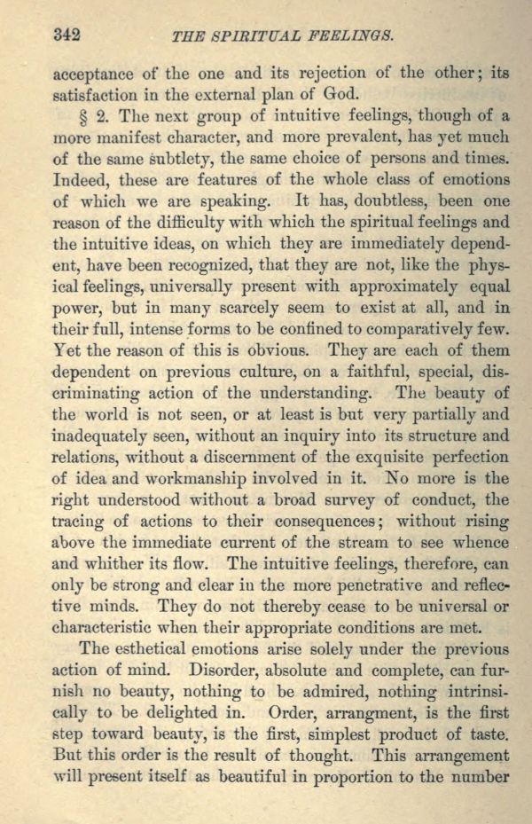 2. The next group of intuitive feelings, though of a more manifest character, and more prevalent, has yet much of the same subtlety, the same choice of persons and times. Indeed, these are features of the whole class of emotions of which we are speaking. It has, doubtless, been one reason of the difficulty with which the spiritual feelings and the intuitive ideas, on which they are immediately dependent, have been recognized, that they are not, like the physical feelings, universally present with approximately equal power, but in many scarcely seem to exist at all, and in their full, intense forms to be confined to comparatively few. Yet the reason of this is obvious. They are each of them dependent on previous culture, on a faithful, special, discriminating action of the understanding. The beauty of the world is not seen, or at least is but very partially and inadequately seen, without an inquiry into its structure and relations, without a discernment of the exquisite perfection of idea and workmanship involved in it. No more is the right understood without a broad survey of conduct, the tracing of actions to their consequences; without rising above the immediate current of the stream to see whence and whither its flow. The intuitive feelings, therefore, can only be strong and clear in the more penetrative and reflective minds. They do not thereby cease to be universal or characteristic when their appropriate conditions are met.