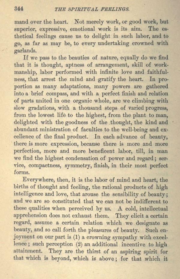 Everywhere, then, it is the labor of mind and heart, the births of thought and feeling, the rational products of high intelligence and love, that arouse the sensibility of beauty; and we are so constituted that we can not be indifferent to these qualities when perceived by us. A cold, intellectual apprehension does not exhaust them. They elicit a certain regard, assume a certain relation which we designate as beauty, and so call forth the pleasures of beauty. Such enjoyment on our part is (1) a crowning sympathy with excellence; such perception (2) an additional incentive to high attainment. They are the thirst of an aspiring spirit for that which is beyond, which is above; for that which it