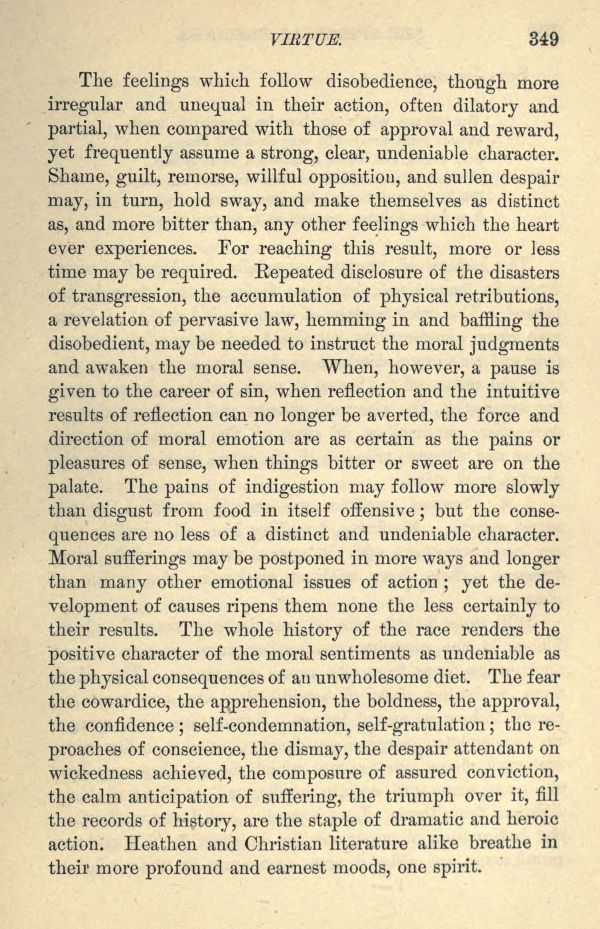 Moral sufferings may be postponed in more ways and longer than many other emotional issues of action; yet the development of causes ripens them none the less certainly to their results. The whole history of the race renders the positive character of the moral sentiments as undeniable as the physical consequences of an unwholesome diet. The fear the cowardice, the apprehension, the boldness, the approval, the confidence; self-condemnation, self-gratulation; the reproaches of conscience, the dismay, the despair attendant on wickedness achieved, the composure of assured conviction, the calm anticipation of suffering, the triumph over it, fill the records of history, are the staple of dramatic and heroic action. Heathen and Christian literature alike breathe in their more profound and earnest moods, one spirit.