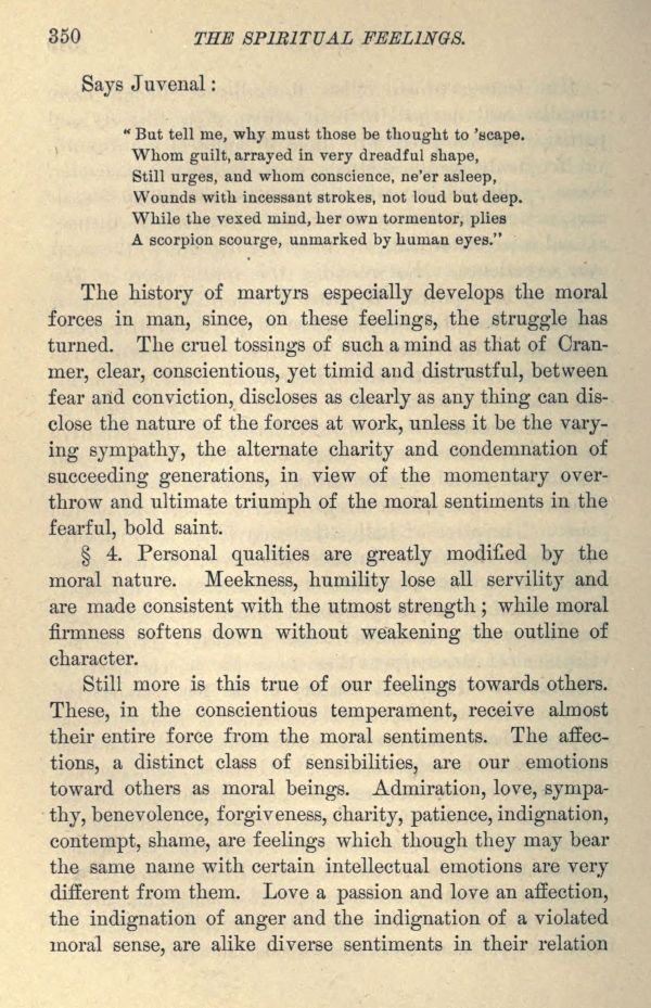 Still more is this true of our feelings towards others. These, in the conscientious temperament, receive almost their entire force from the moral sentiments. The affections, a distinct class of sensibilities, are our emotions toward others as moral beings. Admiration, love, sympathy, benevolence, forgiveness, charity, patience, indignation, contempt, shame, are feelings which though they may bear the same name with certain intellectual emotions are very different from them. Love a passion and love an affection, the indignation of anger and the indignation of a violated moral sense, are alike diverse sentiments in their relation