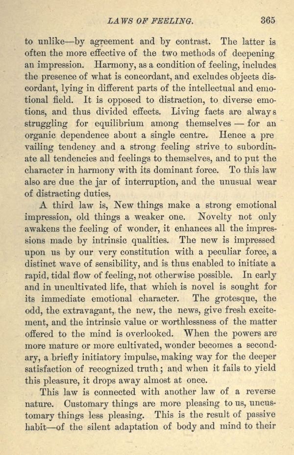 A third law is, New things make a strong emotional impression, old things a weaker one. Novelty not only awakens the feeling of wonder, it enhances all the impressions made by intrinsic qualities. The new is impressed upon us by our very constitution with a peculiar force, a distinct wave of sensibility, and is thus enabled to initiate a rapid, tidal flow of feeling, not otherwise possible. In early and in uncultivated life, that which is novel is sought for its immediate emotional character. The grotesque, the odd, the extravagant, the new, the news, give fresh excitement, and the intrinsic value or worthlessness of the matter offered to the mind is overlooked. When the powers are more mature or more cultivated, wonder becomes a secondary, a briefly initiatory impulse, making way for the deeper satisfaction of recognized truth; and when it fails to yield this pleasure, it drops away almost at once.