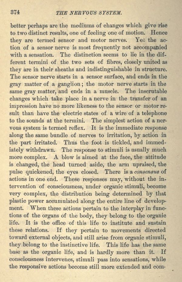 better perhaps are the mediums of changes which give rise to two distinct results, one of feeling one of motion. Hence they are termed sensor and motor nerves. Yet the action of a sensor nerve is most frequently not accompanied with a sensation. The distinction seems to lie in the different termini of the two sets of fibres, closely united as they are in their sheaths and indistinguishable in structure. The sensor nerve starts in a sensor surface, and ends in the gray matter of a ganglion; the motor nerve starts in the same gray matter, and ends in a muscle. The inscrutable changes which take place in a nerve in the transfer of an impression have no more likeness to the sensor or motor result than have the electric states of a wire of a telephone to the sounds at the termini. The simplest action of a nervous system is termed reflex. It is the immediate response along the same bundle of nerves to irritation, by action in the part irritated. Thus the foot is tickled, and immediately withdrawn. The response to stimuli is usually much more complex. A blow is aimed at the face, the attitude is changed, the head turned aside, the arm upraised, the pulse quickened, the eyes closed. There is a consensus of actions in one end. These responses may, without the intervention of consciousness, under organic stimuli, become very complex, the distribution being determined by that plastic power accumulated along the entire line of development. "When these actions pertain to the interplay in functions of the organs of the body, they belong to the organic life. It is the office of this life to institute and sustain these relations. If they pertain to movements directed toward external objects, and still arise from organic stimuli, they belong to the instinctive life. This life has the same base as the organic life, and is hardly more than it. If consciousness intervenes, stimuli pass into sensations, while the responsive actions become still more extended and complex.