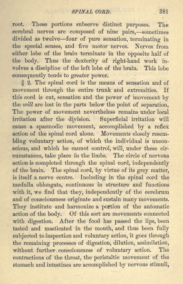 2. The spinal cord is the means of sensation and of movement through the entire trunk and extremities. If this cord is cut, sensation and the power of movement by the will are lost in the parts below the point of separation, The power of movement nevertheless remains under local irritation after the division. Superficial irritation will cause a spasmodic movement, accomplished by a reflex action of the spinal cord alone. Movements closely resembling voluntary action, of which the individual is unconscious, and which he cannot control, will, under these circumstances, take place in the limbs. The circle of nervous action is completed through the spinal cord, independently of the brain. The spinal cord, by virtue of its grey matter, is itself a nerve centre. Including in the spinal cord the medulla oblongata, continuous in structure and functions with it, we find that they, independently of the cerebrum and of consciousness originate and sustain many movements. They institute and harmonize a portion of the automatic action of the body. Of this sort are movements connected with digestion. After the food has passed the lips, been tasted and masticated in the mouth, and thus been fully subjected to inspection and voluntary action, it goes through the remaining processes of digestion, dilution, assimilation, without further consciousness of voluntary action. The contractions of the throat, the peristaltic movement of the stomach and intestines are accomplished by nervous stimuli,