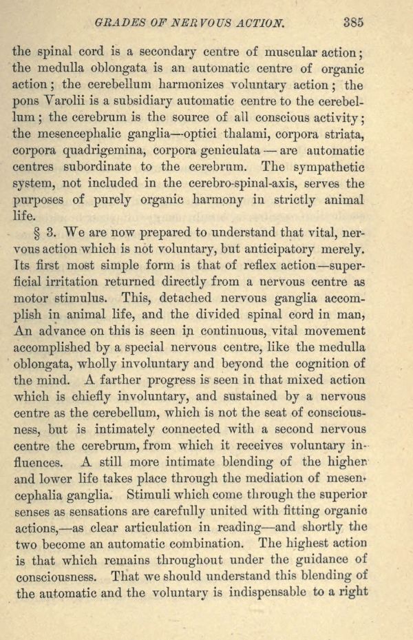 3. We are now prepared to understand that vital, nervous action which is not voluntary, but anticipatory merely. Its first most simple form is that of reflex action superficial irritation returned directly from a nervous centre as motor stimulus. This, detached nervous ganglia accomplish in animal life, and the divided spinal cord in man, An advance on this is seen in continuous, vital movement accomplished by a special nervous centre, like the medulla oblongata, wholly involuntary and beyond the cognition of the mind. A farther progress is seen in that mixed action which is chiefly involuntary, and sustained by a nervous centre as the cerebellum, which is not the seat of consciousness, but is intimately connected with a second nervous centre the cerebrum, from which it receives voluntary influences. A still more intimate blending of the higher, and lower life takes place through the mediation of mesent cephalia ganglia. Stimuli which come through the superior senses as sensations are carefully united with fitting organic actions, as clear articulation in reading and shortly the two become an automatic combination. The highest action is that which remains throughout under the guidance of consciousness. That we should understand this blending of the automatic and the voluntary is indispensable to a right