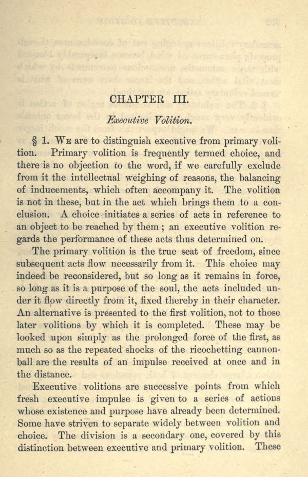 1. We are to distinguish executive from primary volition. Primary volition is frequently termed choice, and there is no objection to the word, if we carefully exclude from it the intellectual weighing of reasons, the balancing of inducements, which often accompany it. The volition is not in these, but in the act which brings them to a conclusion. A choice initiates a series of acts in reference to an object to be reached by them; an executive volition regards the performance of these acts thus determined on.