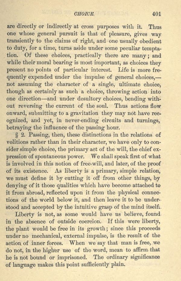 2. Passing, then, these distinctions in the relations of volitions rather than in their character, we have only to consider simple choice, the primary act of the will, the chief expression of spontaneous power. We shall speak first of what is involved in this notion of free-will, and later, of the proof of its existence. As liberty is a primary, simple relation, we must define it by cutting it off from other things, by denying of it those qualities which have become attached to it from abroad, reflected upon it from the physical connections of the world below it, and then leave it to be understood and accepted by the intuitive grasp of the mind itself i.
