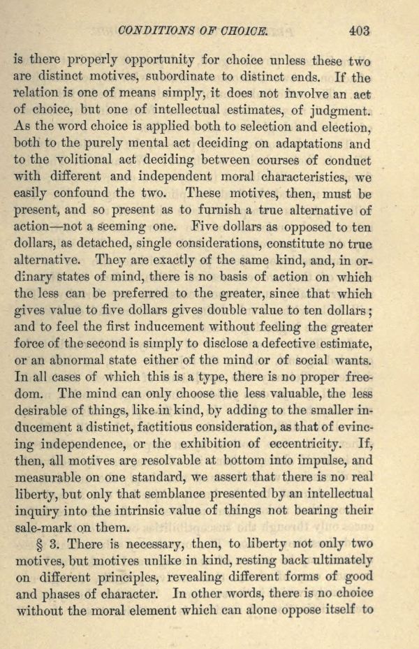 3. There is necessary, then, to liberty not only two motives, but motives unlike in kind, resting back ultimately on different principles, revealing different forms of good and phases of character. In other words, there is no choice without the moral element which can alone oppose itself to