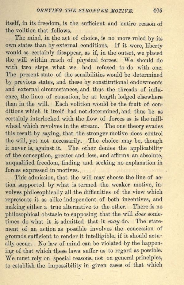 This admission, that the will may choose the line of action supported by what is termed the weaker motive, involves philosophically all the difficulties of the view which represents it as alike independent of both incentives, and making either a true alternative to the other. There is no philosophical obstacle to supposing that the will does sometimes do what it is admitted that it may do. The statement of an action as possible involves the concession of grounds sufficient to render it intelligible, if it should actually occur. No law of mind can be violated by the happening of that which these laws suffer us to regard as possible. "We must rely on special reasons, not on general principles, to establish the impossibility in given cases of that which