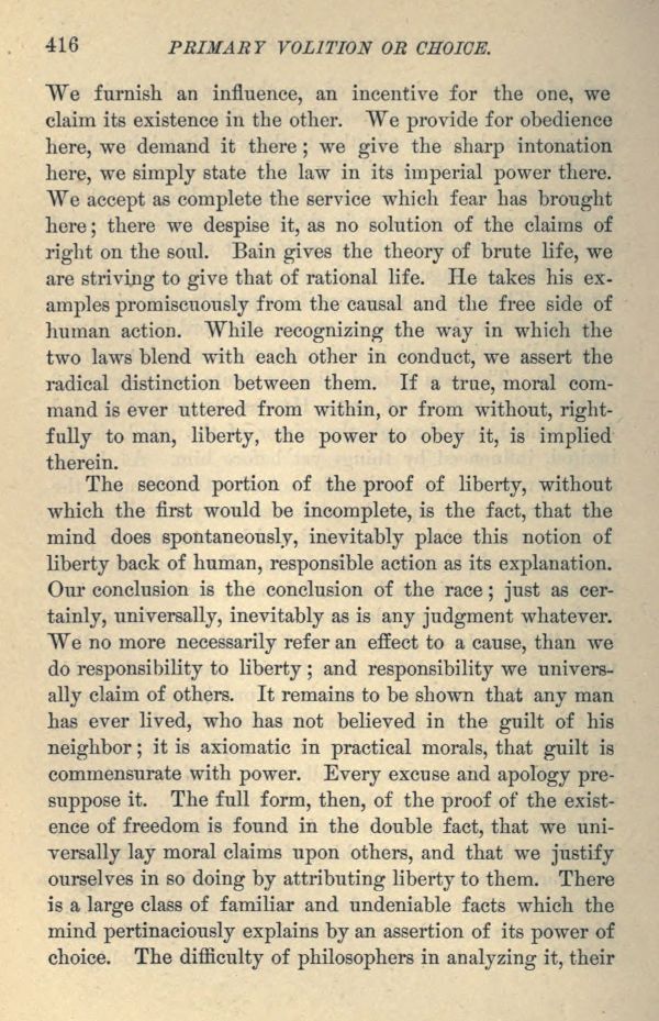The second portion of the proof of liberty, without which the first would be incomplete, is the fact, that the mind does spontaneously, inevitably place this notion of liberty back of human, responsible action as its explanation. Our conclusion is the conclusion of the race; just as certainly, universally, inevitably as is any judgment whatever. We no more necessarily refer an effect to a cause, than we do responsibility to liberty; and responsibility we universally claim of others. It remains to be shown that any man has ever lived, who has not believed in the guilt of his neighbor; it is axiomatic in practical morals, that guilt is commensurate with power. Every excuse and apology presuppose it. The full form, then, of the proof of the existence of freedom is found in the double fact, that we universally lay moral claims upon others, and that we justify ourselves in so doing by attributing liberty to them. There is a large class of familiar and undeniable facts which the mind pertinaciously explains by an assertion of its power of choice. The difficulty of philosophers in analyzing it, their