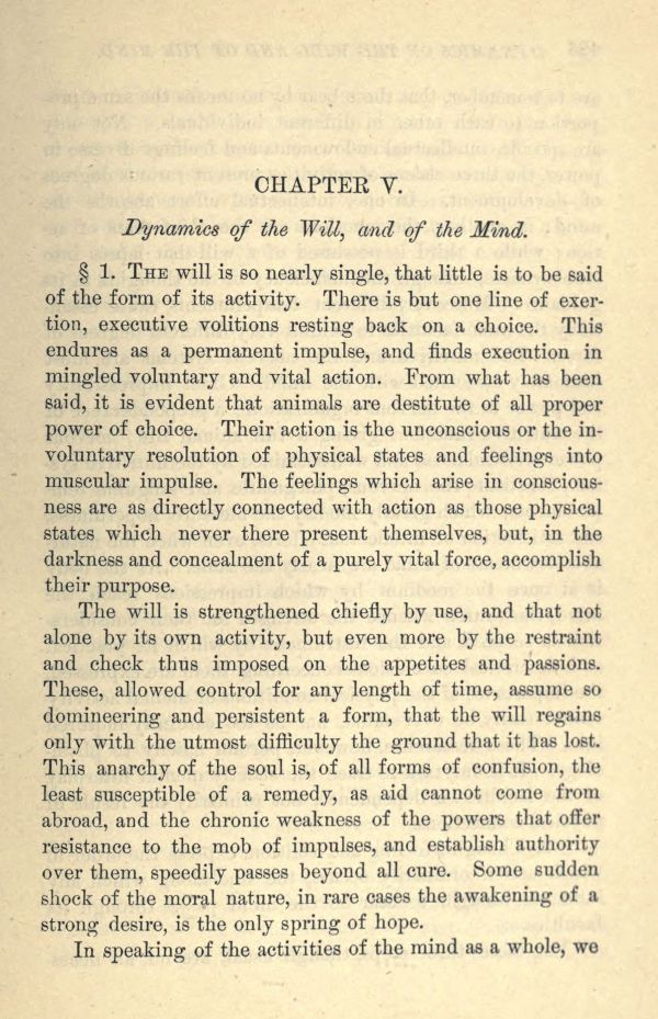 1. THE will is so nearly single, that little is to be said of the form of its activity. There is but one line of exertion, executive volitions resting back on a choice. This endures as a permanent impulse, and finds execution in mingled voluntary and vital action. From what has been said, it is evident that animals are destitute of all proper power of choice. Their action is the unconscious or the involuntary resolution of physical states and feelings into muscular impulse. The feelings which arise in consciousness are as directly connected with action as those physical states which never there present themselves, but, in the darkness and concealment of a purely vital force, accomplish their purpose.