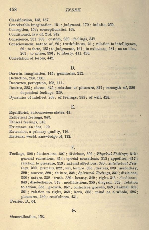 Feelings, 306; distinctions, 307; divisions, 309; Physical Feelings, 312; general sensations, 313; special sensations, 315; appetites, 317; relation to pleasure, 319; natural affections, 320; Intellectual Feelings, 322; primary, 322; wit, humor, 325; desires, 323; secondary, 329; success, 329; failure, 332; Spiritual Feelings, 337; divisions, 338; nature, 338; truth, 339; beauty, 342; right, 346; obedience, 348; disobedience, 349; modifications, 350; diagram, 352; relation to action, 355; growth, 357; collective growth, 359; animal life, 361; relation to right, 362; laws, 363; mind as a whole, 426; pleasures, 430; restfulness, 431.