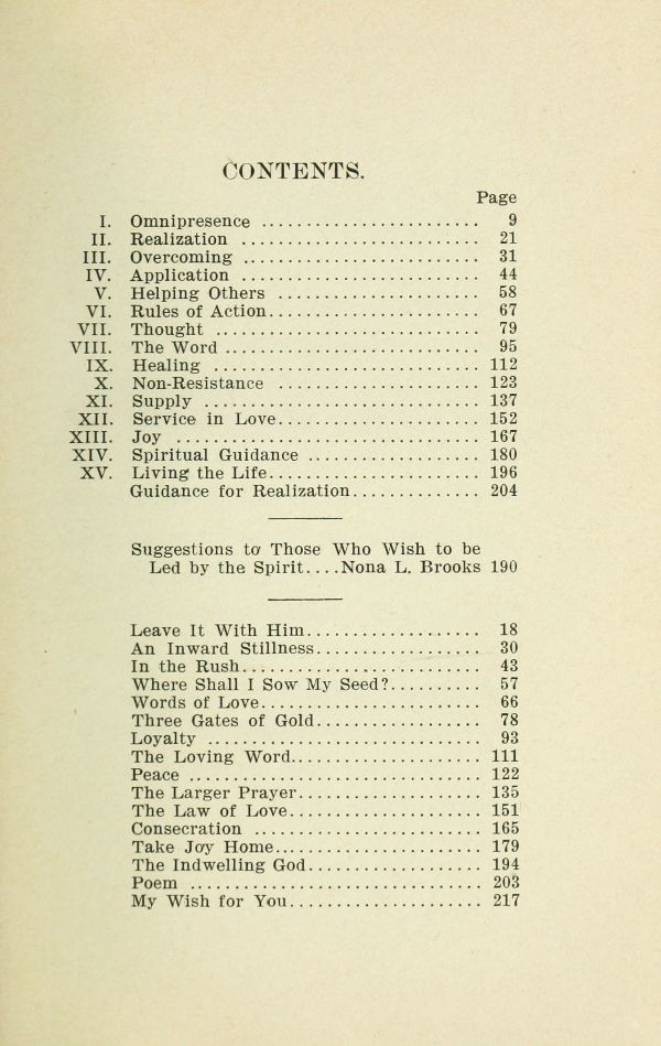 Contents - Omnipresence - Realization - Overcoming - Application - Helping Others - Rules of Action - Thought - The Word - Healing - Non-Resistance - Supply - Service in Love - Joy - Spiritual Guidance - Living the Life - Guidance for Realization - Suggestions from Nona L. Brooks - Leave It With Him - An Inward Stillness - In the Rush - Where Shall I Sow My Seed? - Words of Love - Three Gates of Gold - Loyalty