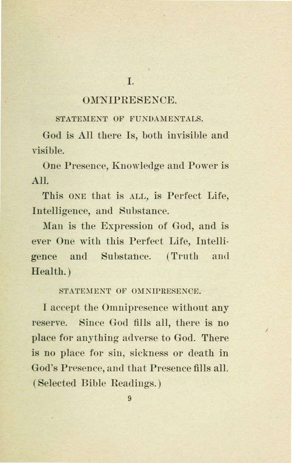 Man is the Expression of God, and is ever One with this Perfect Life, Intelligence and Substance. (Truth and Health.)