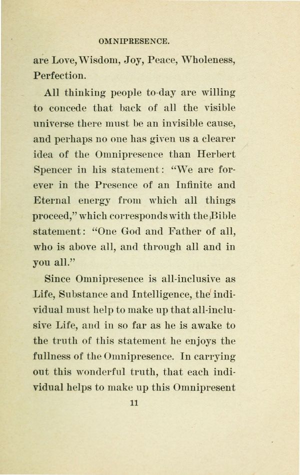 All thinking people to-day are willing to concede that back of all the visible universe there must be an invisible cause, and perhaps no one has given us a clearer idea of the Omnipresence than Herbert Spencer in his statement : "We are forever in the Presence of an Infinite and Eternal energy from which all things proceed," which corresponds with the Bible statement : "One God and Father of all, who is above all, and through all and in you all."