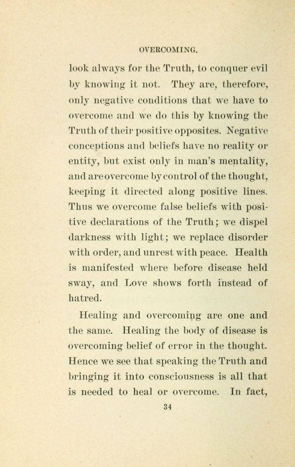 look always for the Truth, to conquer evil by knowing it not. They are, therefore, only negative conditions that we have to overcome and we do this by knowing the Truth of their positive opposites. Negative conceptions and beliefs have no reality or entity, but exist only in man's mentality, and are overcome by control of the thought, keeping it directed along positive lines. Thus we overcome false beliefs with positive declarations of the Truth; we dispel darkness with light; we replace disorder with order, and unrest with peace. Health is manifested where before disease held sway, and Love shows forth instead of hatred.