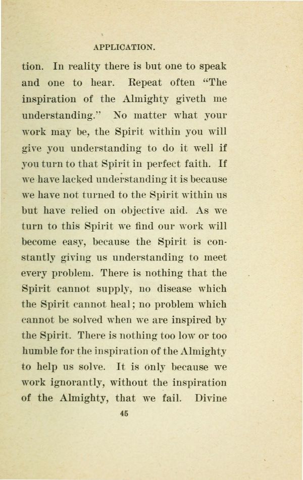 In reality there is but one to speak and one to hear. Repeat often "The inspiration of the Almighty giveth me understanding." No matter what your work may be, the Spirit within you will give you understanding to do it well if you turn to that Spirit in perfect faith. If we have lacked understanding it is because we have not turned to the Spirit within us but have relied on objective aid. As we turn to this Spirit we find our work will become easy, because the Spirit is constantly giving us understanding to meet every problem. There is nothing that the Spirit cannot supply, no disease which the Spirit cannot heal; no problem which cannot be solved when we are inspired by the Spirit. There is nothing too low or too humble for the inspiration of the Almighty to help us solve. It is only because we work ignorantly, without the inspiration of the Almighty, that we fail. Divine