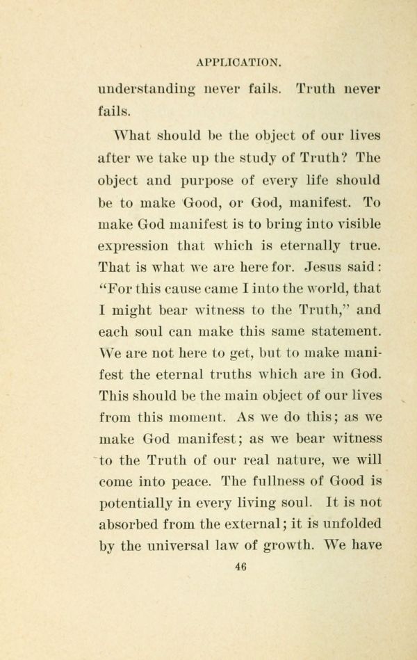 What should be the object of our lives after we take up the study of Truth? The object and purpose of every life should be to make Good, or God, manifest. To make God manifest is to bring into visible expression that which is eternally true. That is what we are here for. Jesus said: "For this cause came I into the world, that I might bear witness to the Truth," and each soul can make this same statement. We are not here to get, but to make manifest the eternal truths which are in God. This should be the main object of our lives from this moment. As we do this; as we make God manifest; as we bear witness - to the Truth of our real nature, we will come into peace. The fullness of Good is potentially in every living soul. It is not absorbed from the external; it is unfolded by the universal law of growth. We have