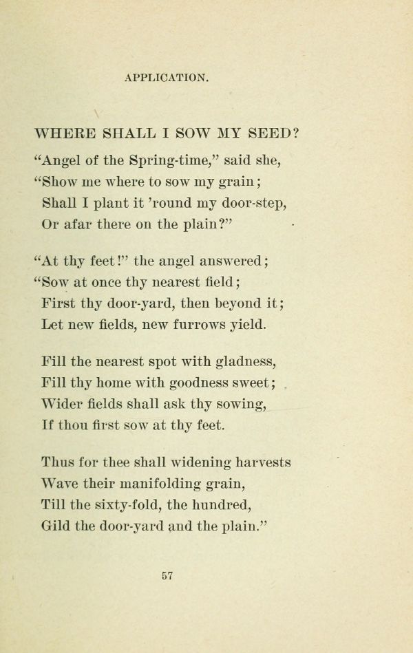 Fill the nearest spot with gladness, Fill thy home with goodness sweet; Wider fields shall ask thy sowing, If thou first sow at thy feet.