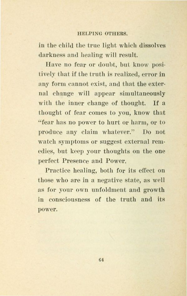 Have no fear or doubt, but know positively that if the truth is realized, error in any form cannot exist, and that the external change will appear simultaneously with the inner change of thought. If a thought of fear comes to you, know that "fear has no power to hurt or harm, or to produce any claim whatever." Do not watch symptoms or suggest external remedies, but keep your thoughts on the one perfect Presence and Power.