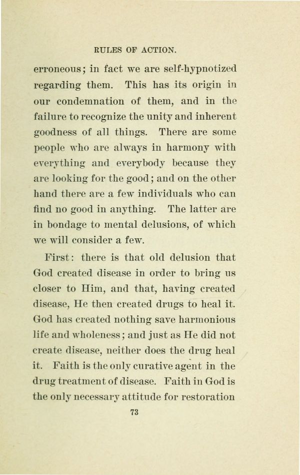 First: there is that old delusion that God created disease in order to bring us closer to Him, and that, having created disease, He then created drugs to heal it. God has created nothing save harmonious life and wholeness; and just as He did not create disease, neither does the drug heal it. Faith is the only curative agent in the drug treatment of disease. Faith in God is the only necessary attitude for restoration