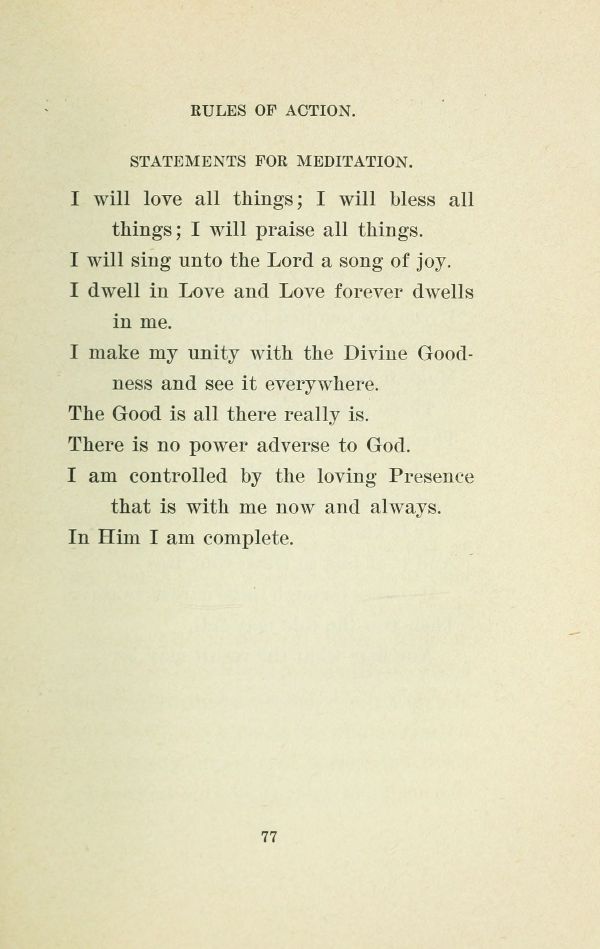 Contents - Omnipresence - Realization - Overcoming - Application - Helping Others - Rules of Action - Thought - The Word - Healing - Non-Resistance - Supply - Service in Love - Joy - Spiritual Guidance - Living the Life - Guidance for Realization - Suggestions from Nona L. Brooks - Leave It With Him - An Inward Stillness - In the Rush - Where Shall I Sow My Seed? - Words of Love - Three Gates of Gold - Loyalty