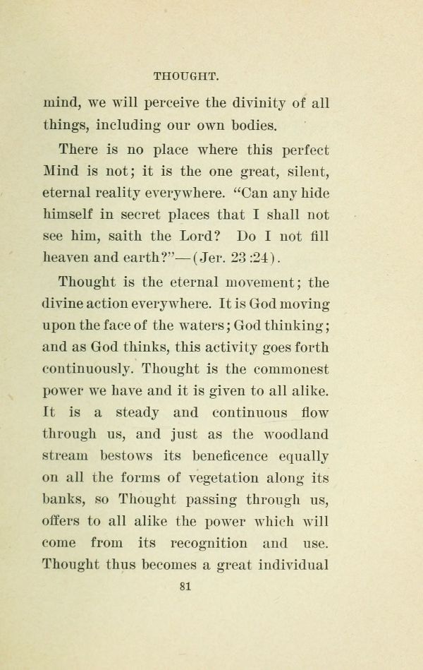 Thought is the eternal movement; the divine action everywhere. It is God moving upon the face of the waters; God thinking; and as God thinks, this activity goes forth continuously. Thought is the commonest power we have and it is given to all alike. It is a steady and continuous flow through us, and just as the woodland stream bestows its beneficence equally on all the forms of vegetation along its banks, so Thought passing through us, offers to all alike the power which will come from its recognition and use. Thought thus becomes a great individual