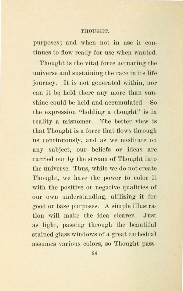 Thought is the vital force actuating the universe and sustaining the race in its life journey. It is not generated within, nor can it be held there any more than sunshine could be held and accumulated. So the expression "holding a thought" is in reality a misnomer. The better view is that Thought is a force that flows through us continuously, and as we meditate on any subject, our beliefs or ideas are carried out by the stream of Thought into the universe. Thus, while we do not create Thought, we have the power to color it with the positive or negative qualities of our own understanding, utilizing it for good or base purposes. A simple illustration will make the idea clearer. Just as light, passing through the beautiful stained glass windows of a great cathedral assumes various colors, so Thought passing