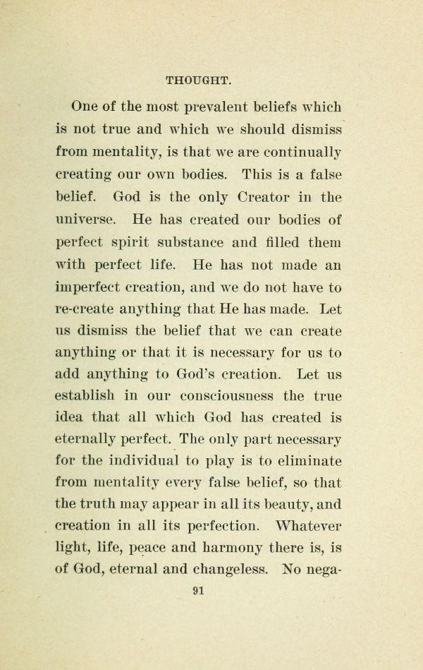 One of the most prevalent beliefs which is not true and which we should dismiss from mentality, is that we are continually creating our own bodies. This is a false belief. God is the only Creator in the universe. He has created our bodies of perfect spirit substance and filled them with perfect life. He has not made an imperfect creation, and we do not have to re-create anything that He has made. Let us dismiss the belief that we can create anything or that it is necessary for us to add anything to God's creation. Let us establish in our consciousness the true idea that all which God has created is eternally perfect. The only part necessary for the individual to play is to eliminate from mentality every false belief, so that the truth may appear in all its beauty, and creation in all its perfection. Whatever light, life, peace and harmony there is, is of God, eternal and changeless. No negative