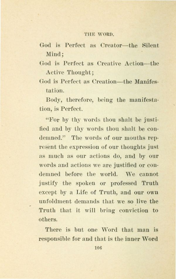 "For by thy words thou shalt be justified and by thy words thou shalt be condemned." The words of our mouths represent the expression of our thoughts just as much as our actions do, and by our words and actions we are justified or condemned before the world. We cannot justify the spoken or professed Truth except by a Life of Truth, and our own unfoldment demands that we so live the Truth that it will bring conviction to others.