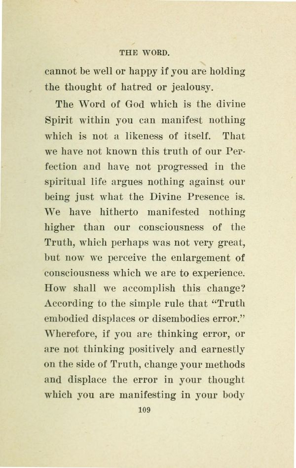 The Word of God which is the divine Spirit within you can manifest nothing which is not a likeness of itself. That we have not known this truth of our Perfection and have not progressed in the spiritual life argues nothing against our being just what the Divine Presence is. We have hitherto manifested nothing higher than our consciousness of the Truth, which perhaps was not very great, but now we perceive the enlargement of consciousness which we are to experience. How shall we accomplish this change? According to the simple rule that "Truth embodied displaces or disembodies error." Wherefore, if you are thinking error, or are not thinking positively and earnestly on the side of Truth, change your methods and displace the error in your thought which you are manifesting in your body
