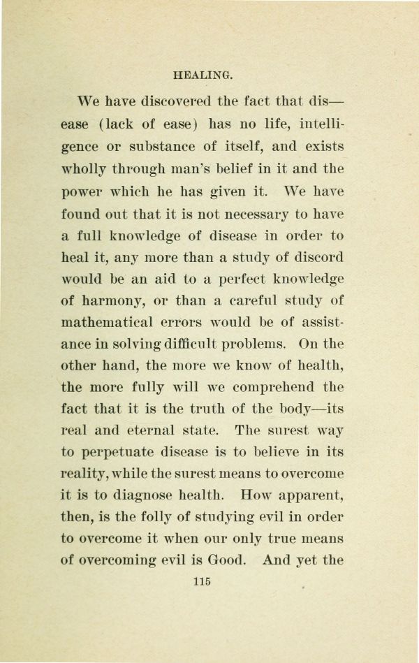 We have discovered the fact that disease (lack of ease) has no life, intelligence or substance of itself, and exists wholly through man's belief in it and the power which he has given it. We have found out that it is not necessary to have a full knowledge of disease in order to heal it, any more than a study of discord would be an aid to a perfect knowledge of harmony, or than a careful study of mathematical errors would be of assistance in solving difficult problems. On the other hand, the more we know of health, the more fully will we comprehend the fact that it is the truth of the body --- its real and eternal state. The surest way to perpetuate disease is to believe in its reality, while the surest means to overcome it is to diagnose health. How apparent, then, is the folly of studying evil in order to overcome it when our only true means of overcoming evil is Good. And yet the