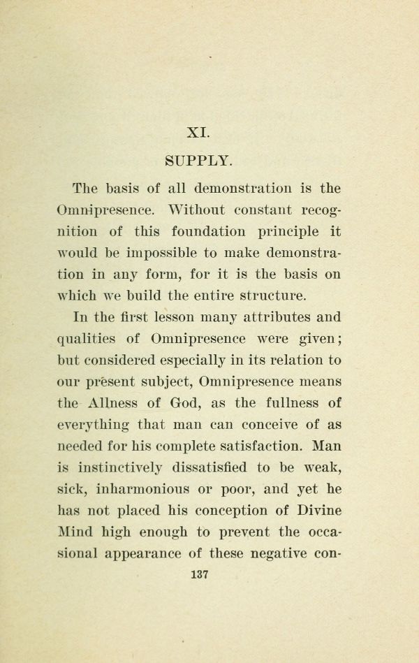 In the first lesson many attributes and qualities of Omnipresence were given but considered especially in its relation to our present subject, Omnipresence means the Allness of God, as the fullness of everything that man can conceive of as needed for his complete satisfaction. Man is instinctively dissatisfied to be weak, sick, inharmonious or poor, and yet he has not placed his conception of Divine Mind high enough to prevent the occasional appearance of these negative conditions.