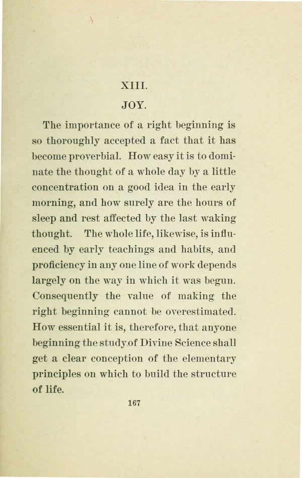 The importance of a right beginning is so thoroughly accepted a fact that it has become proverbial. How easy it is to dominate the thought of a whole day by a little concentration on a good idea in the early morning, and how surely are the hours of sleep and rest affected by the last waking thought. The whole life, likewise, is influenced by early teachings and habits, and proficiency in any one line of work depends largely on the way in which it was begun. Consequently the value of making the right beginning cannot be overestimated. How essential it is, therefore, that anyone beginning the study of Divine Science shall get a clear conception of the elementary principles on which to build the structure of life.