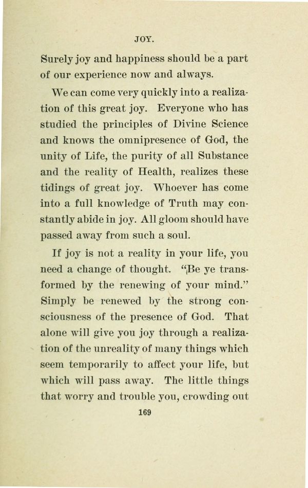 If joy is not a reality in your life, you need a change of thought. ",Be ye transformed by the renewing of your mind." Simply be renewed by the strong consciousness of the presence of God. That alone will give you joy through a realization of the unreality of many things which seem temporarily to affect your life, but which will pass away. The little things that worry and trouble you, crowding out