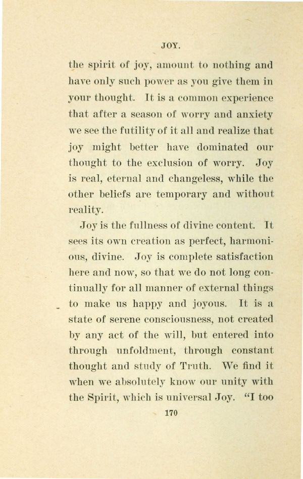 the spirit of joy, amount to nothing and have only such power as you give them in your thought. It is a common experience that after a season of worry and anxiety we see the futility of it all and realize that joy might better have dominated our thought to the exclusion of worry. Joy is real, eternal and changeless, while the other beliefs are temporary and without reality.