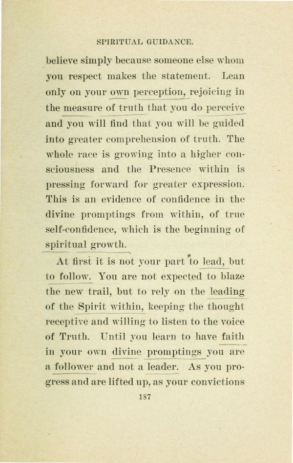 At first it is not your part to lead, but to follow. You are not expected to blaze the new trail, but to rely on the leading of the Spirit within, keeping the thought receptive and willing to listen to the voice of Truth. Until you learn to have faith in your own divine promptings you are a follower and not a leader. As you progress and are lifted up, as your convictions