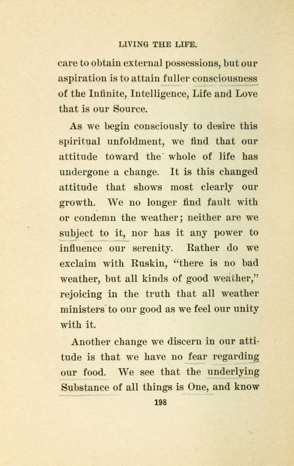 As we begin consciously to desire this spiritual unfoldment, we find that our attitude toward the' whole of life has undergone a change. It is this changed attitude that shows most clearly our growth. We no longer find fault with or condemn the weather; neither are we subject to it, nor has it any power to influence our serenity. Rather do we exclaim with Ruskin, "there is no bad weather, but all kinds of good weather," rejoicing in the truth that all weather ministers to our good as we feel our unity with it.