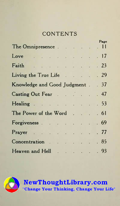Foreword - The Omnipresence - Love - Faith - Living the True Life - Knowledge and Good Judgment - Casting Out Fear - Healing - The Power of the Word - Forgiveness - Prayer - Concentration - Heaven and Hell - Contents -