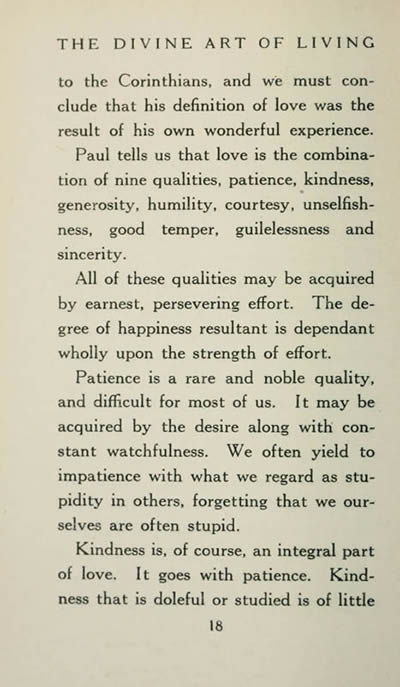 to the Corinthians. and we must conclude that his definition of love was the result of his own wonderful experience. Paul tells us that love is the combination of nine qualities, patience, kindness. generosity, humility, courtesy. unselfishness, good temper. guilelessness and sincerity.