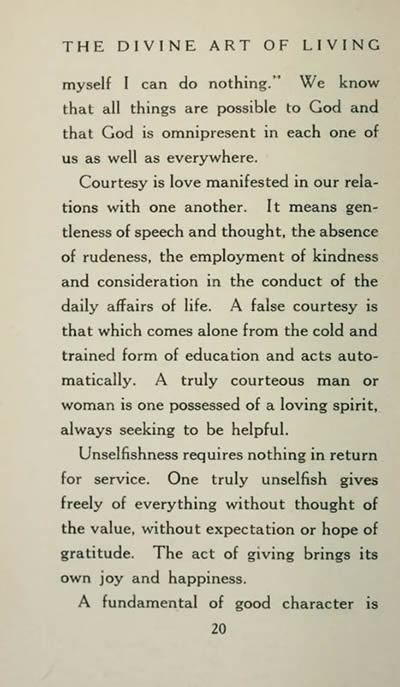 Courtesy is love manifested in our relations with one another. It means gentleness of speech and thought, the absence of rudeness. the employment of kindness and consideration in the conduct of the daily affairs of life. A false courtesy is that which comes alone from the cold and trained form of education and acts automatically. A truly courteous man or woman is one possessed of a loving spirit, always seeking to be helpful.