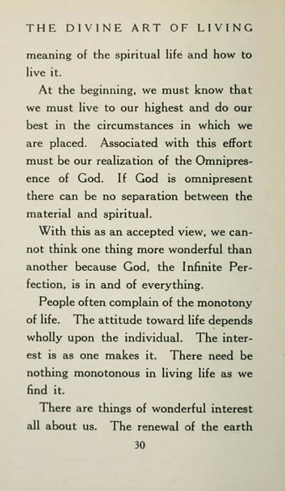 At the beginning, we must know that we must live to our highest and do our best in the circumstances in which we are placed. Associated with this effort most be our realization of the Omnipresence of God, If God is omnipresent there can be no separation between the material and spiritual.