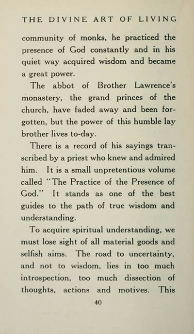There is a record of his sayings transcribed by a priest who knew and admired him. It is a small unpretentious volume called "The Practice of the Presence of God." It stands as one of the best guides to the path of true wisdom and understanding.