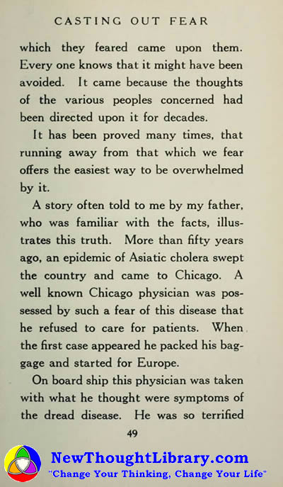A story often told to me by my father, who was familiar with the facts, illustrates this truth. More than fifty years ago. en epidemic of Asiatic cholera swept the country and came to Chicago. A well known Chicago physician was possessed by such a fear of this disease that he refused to care for patients. When the first case appeared he packed his baggage and started for Europe.
