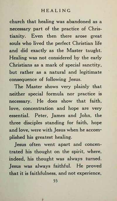 The Master shows very plainly that neither special formula nor practice is necessary. He does show that faith, love, concentration and hope are very essential. Peter, James and John, the three disciples standing for faith, hope and love, were with Jesus when he accomplished his greatest healing.